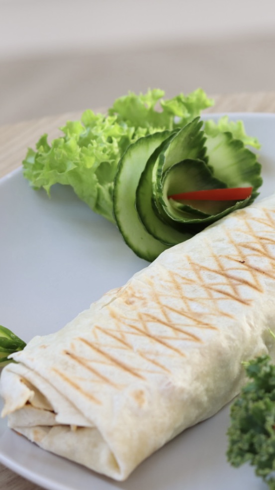 Tortilla kurczak (kurczak, sałata mix, ogórek, pomidor, papryka zielona, papryka czerwona, cebula czerwona, sos ailloili)