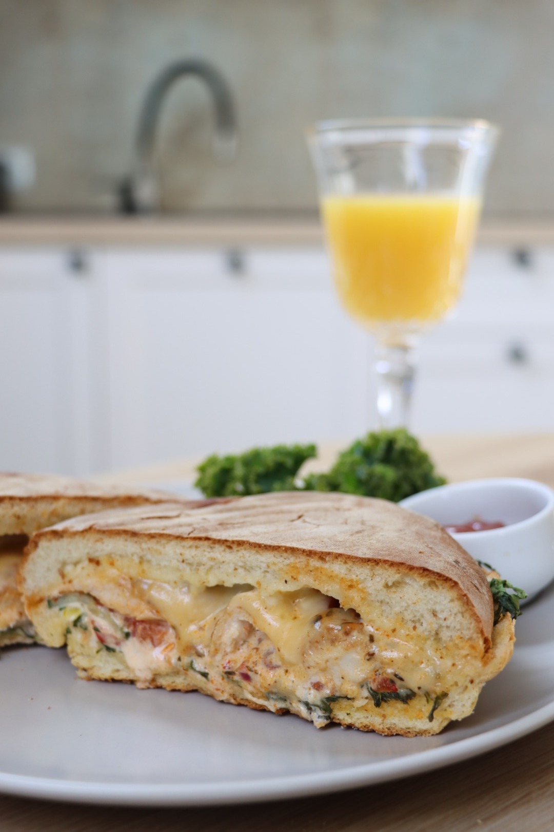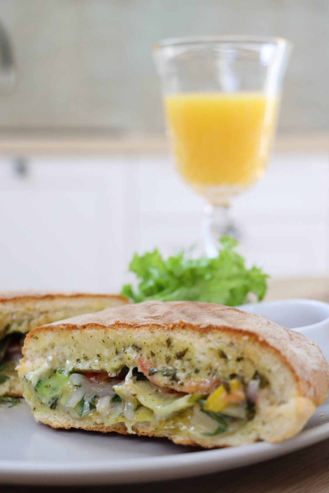 Panini z camembertrm (ser camembert, pomidor, ogórek, cebula czerwona, papryka czerwona, pesto, sos czosnkowy)